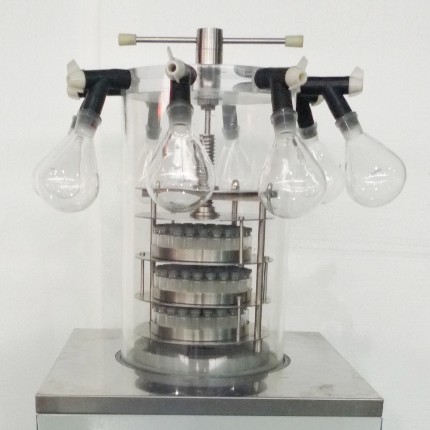 ·在干燥室外部接裝燒瓶,對(duì)旋凍在瓶內(nèi)壁的物料進(jìn)行干燥,這時(shí)燒瓶作為容器接在干燥箱外的歧管上,燒瓶中的物料靠室溫加熱,通過多歧管開關(guān)裝置,可按需要隨時(shí)取下或裝上燒瓶,不需要停機(jī)。